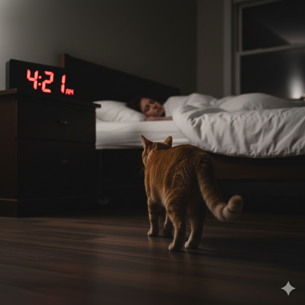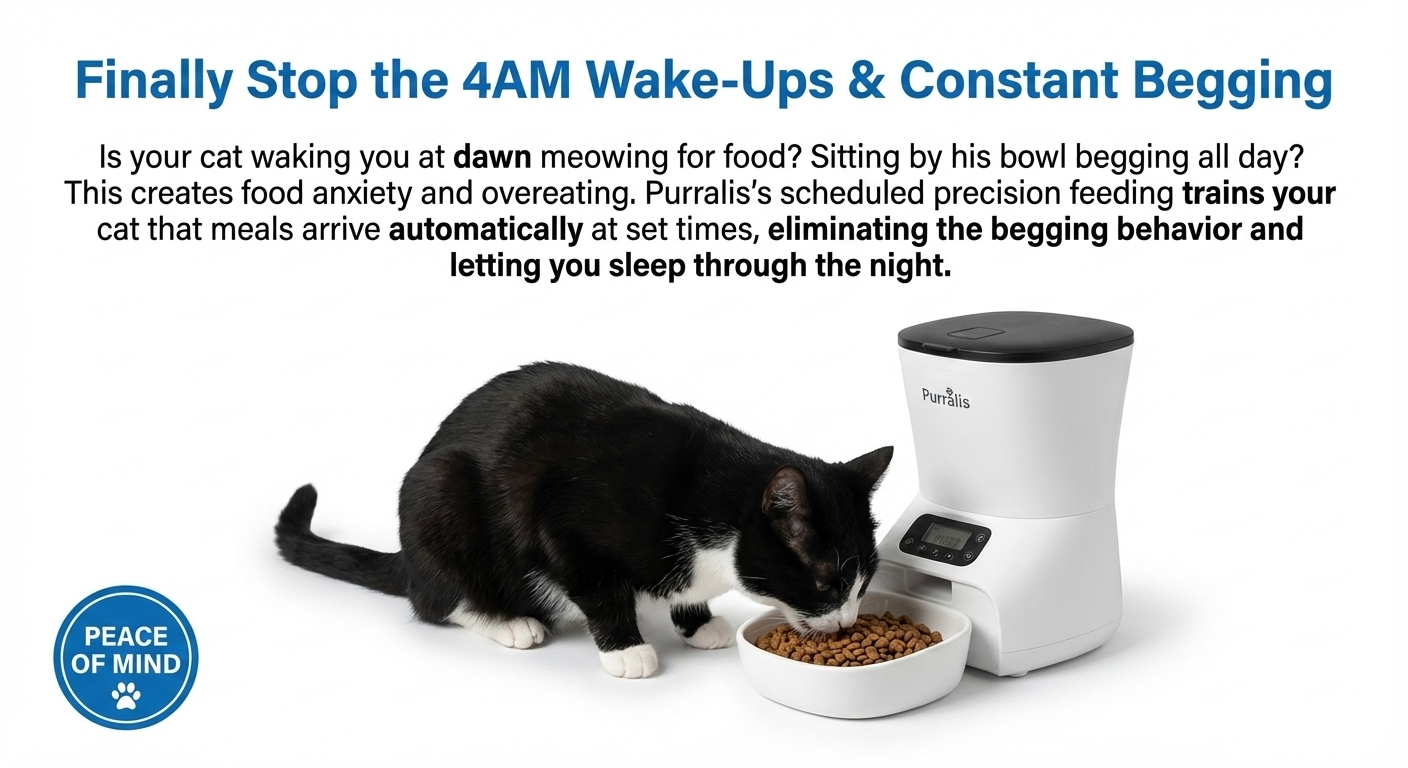 When food arrives at the same time daily, cats stop checking. They stop waiting. They stop waking you.